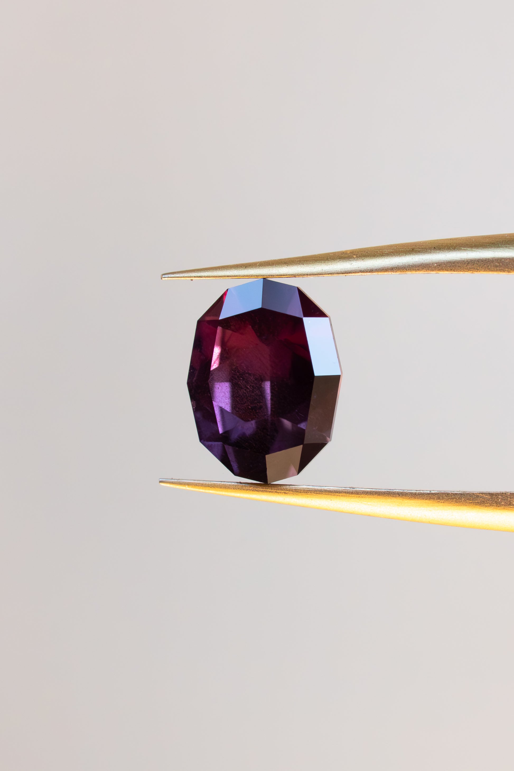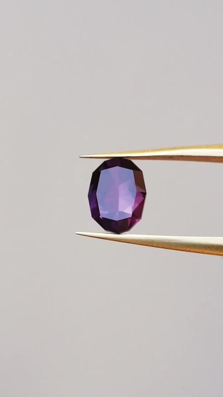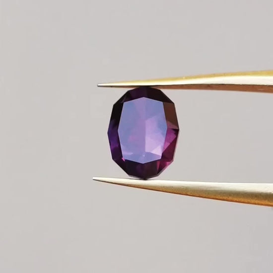 This unheated Umba sapphire is faceted in a new oval design I created. It has a lovely, saturated plum burgundy color, and very light amount of silk.