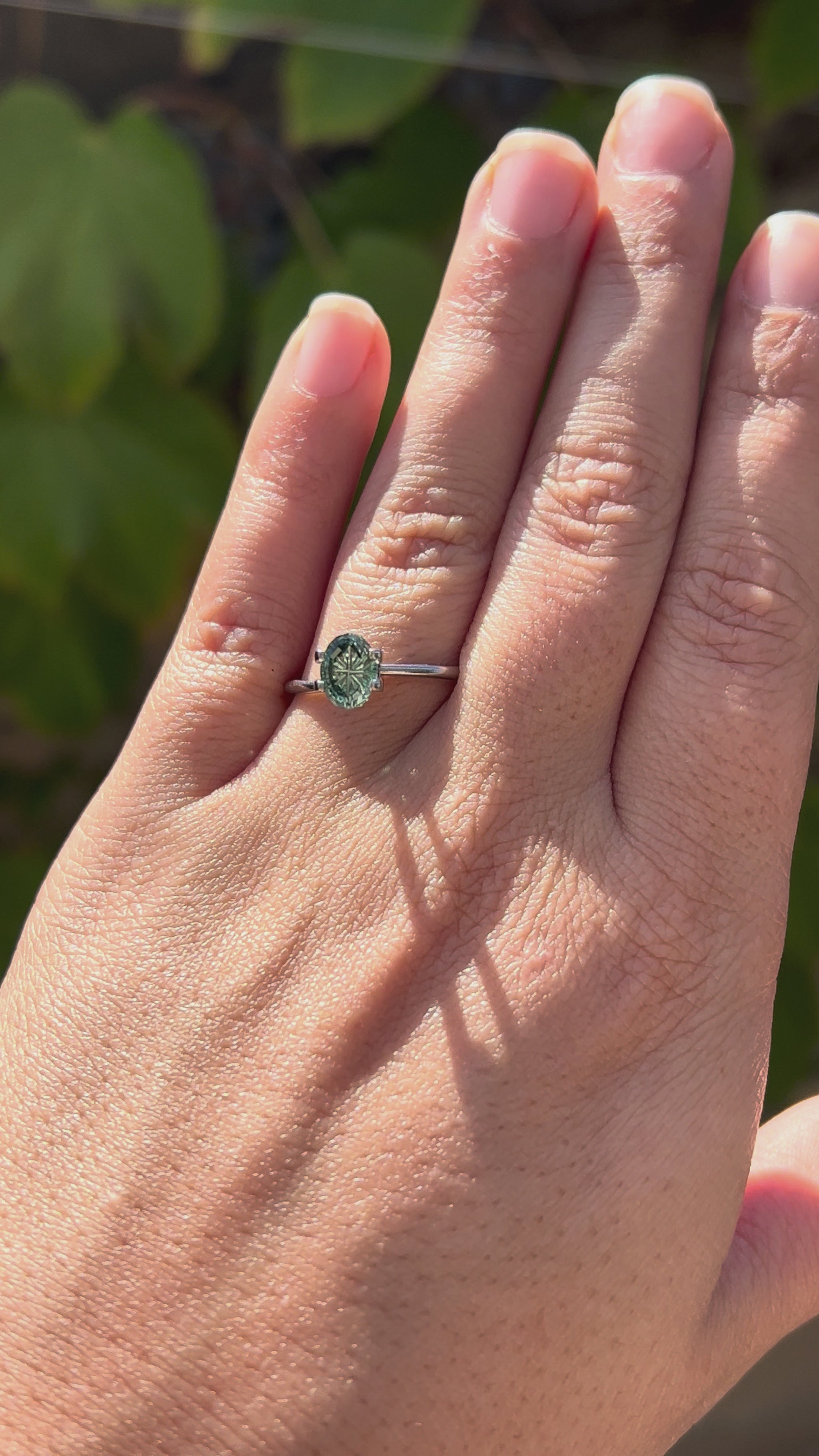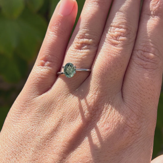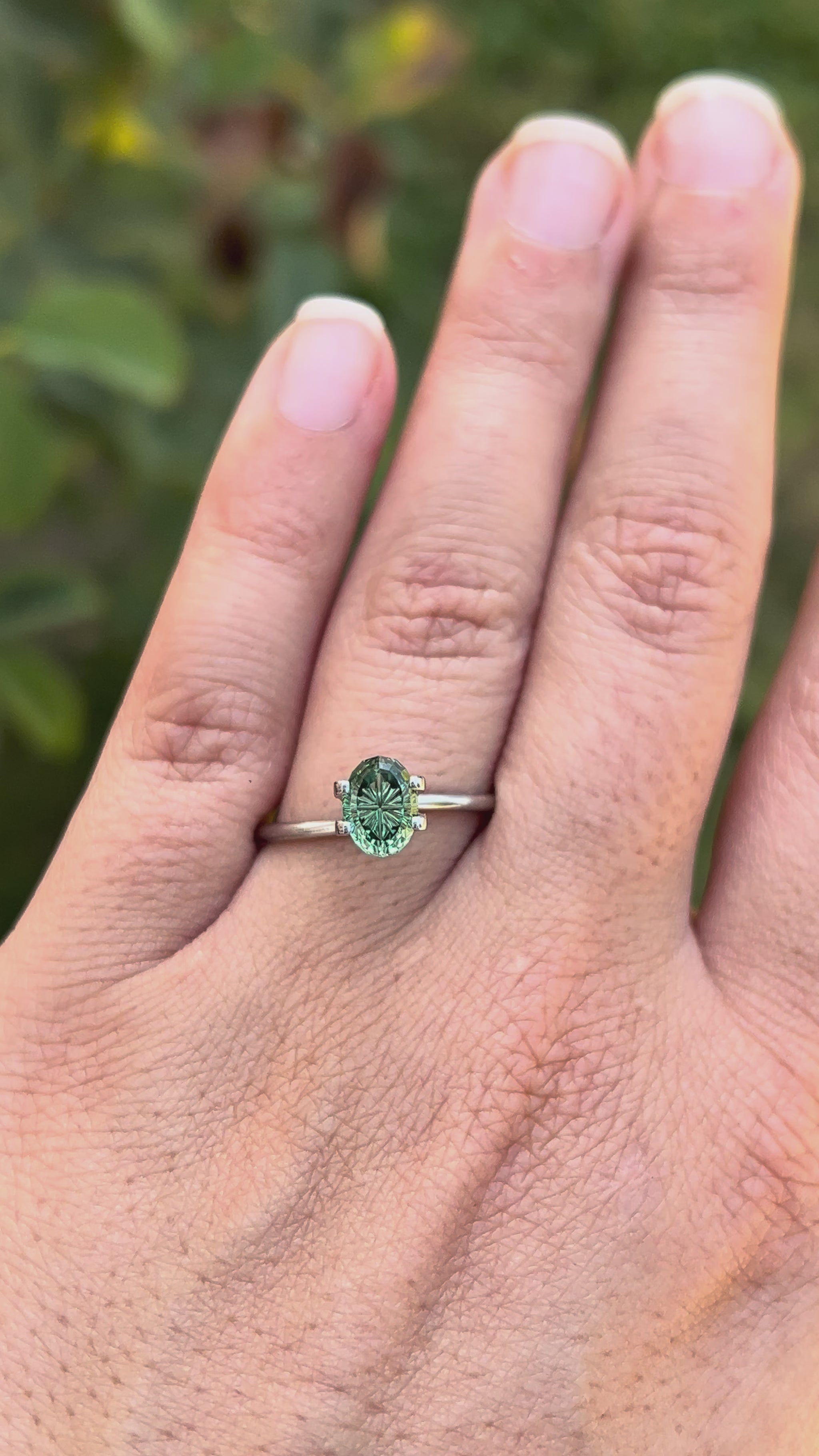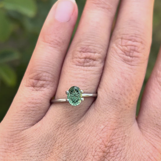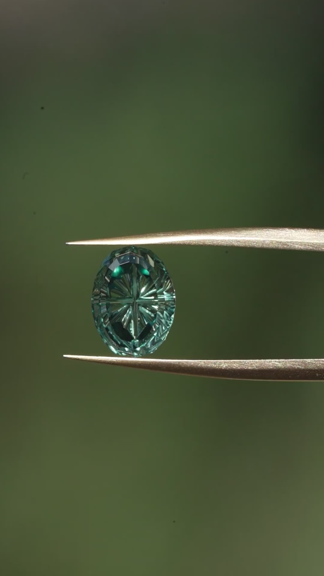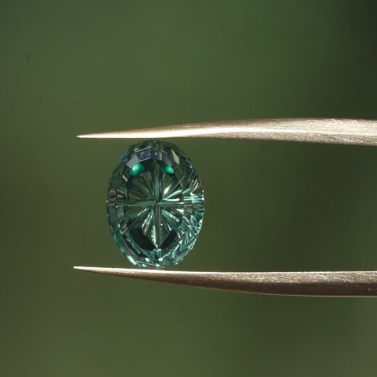 This green lab sapphire is faceted in a fantasy cut oval shape I created. This design was made with a darker border around the corners of the fantasy grooves, which you can see when viewing the gem straight on. The tips of the grooves are a bit wider, and so they window a little, which will reflect the color of the band in the gem once set.