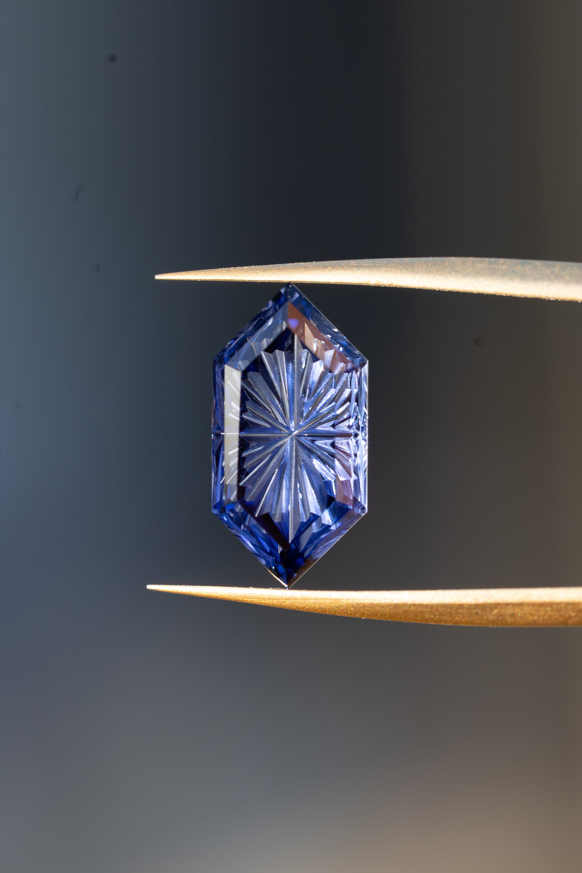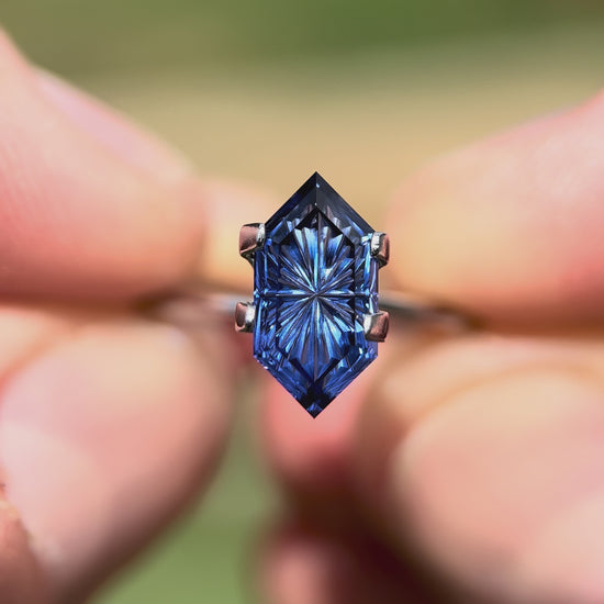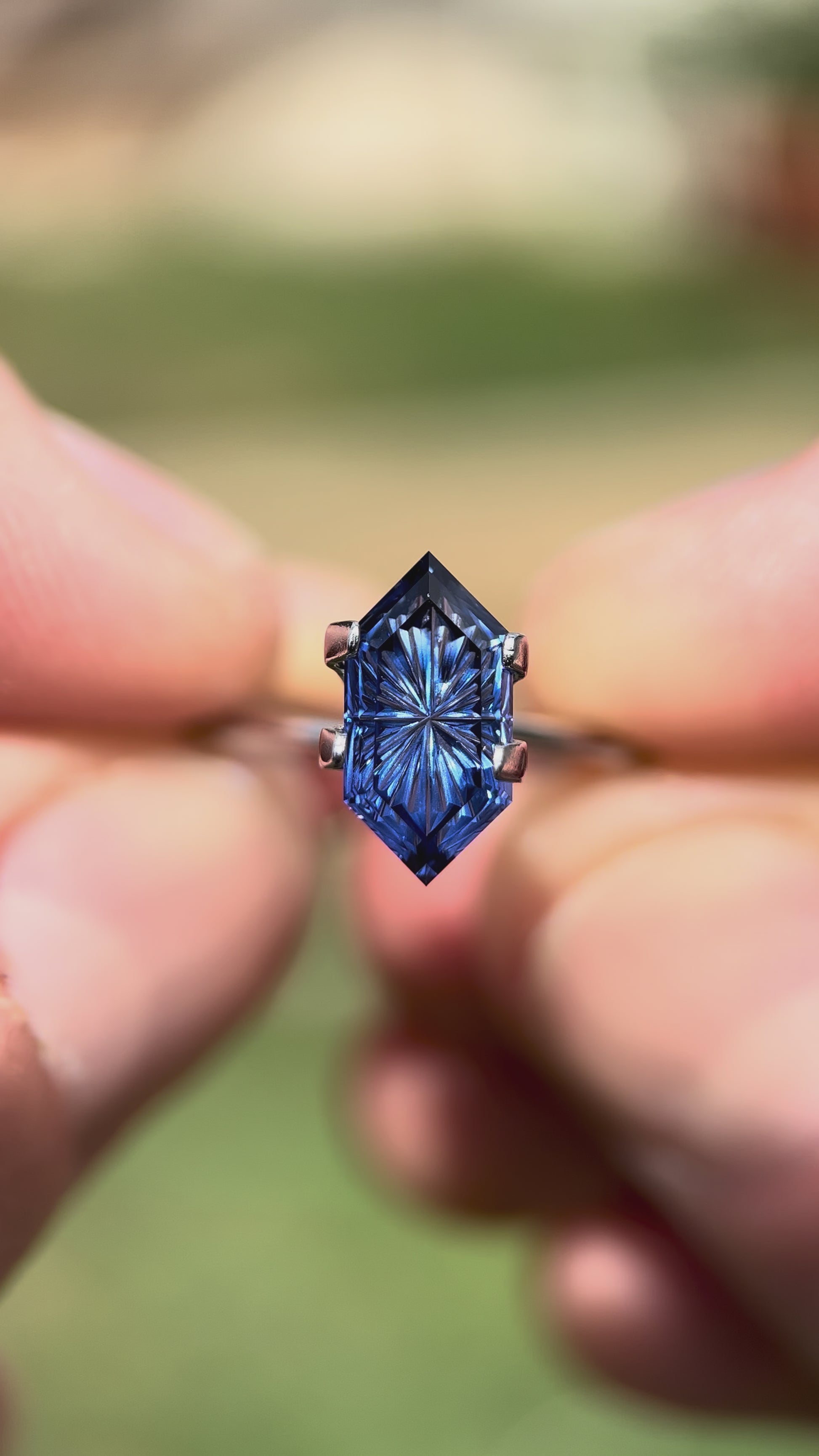 This blue lab sapphire is faceted in a fantasy cut dutch marquise shape. It has great spread, so it looks bigger than the carat weight would suggest, and really twinkles in sunlight!
