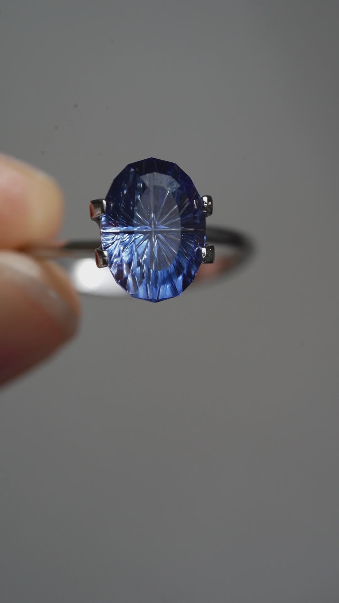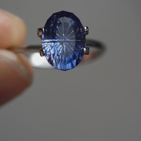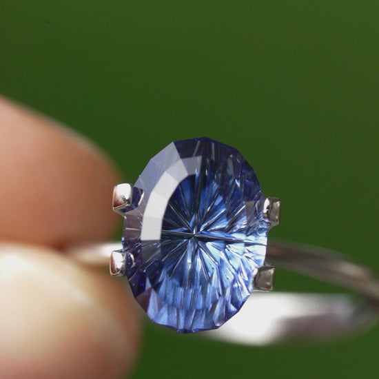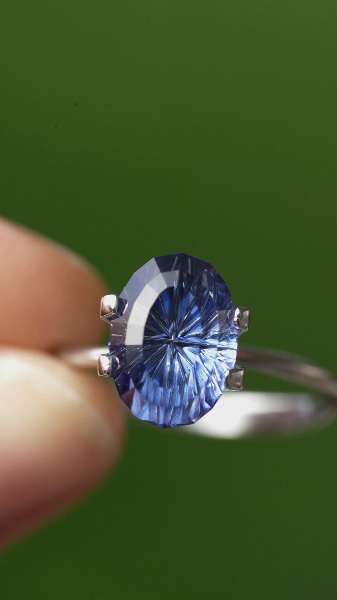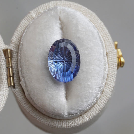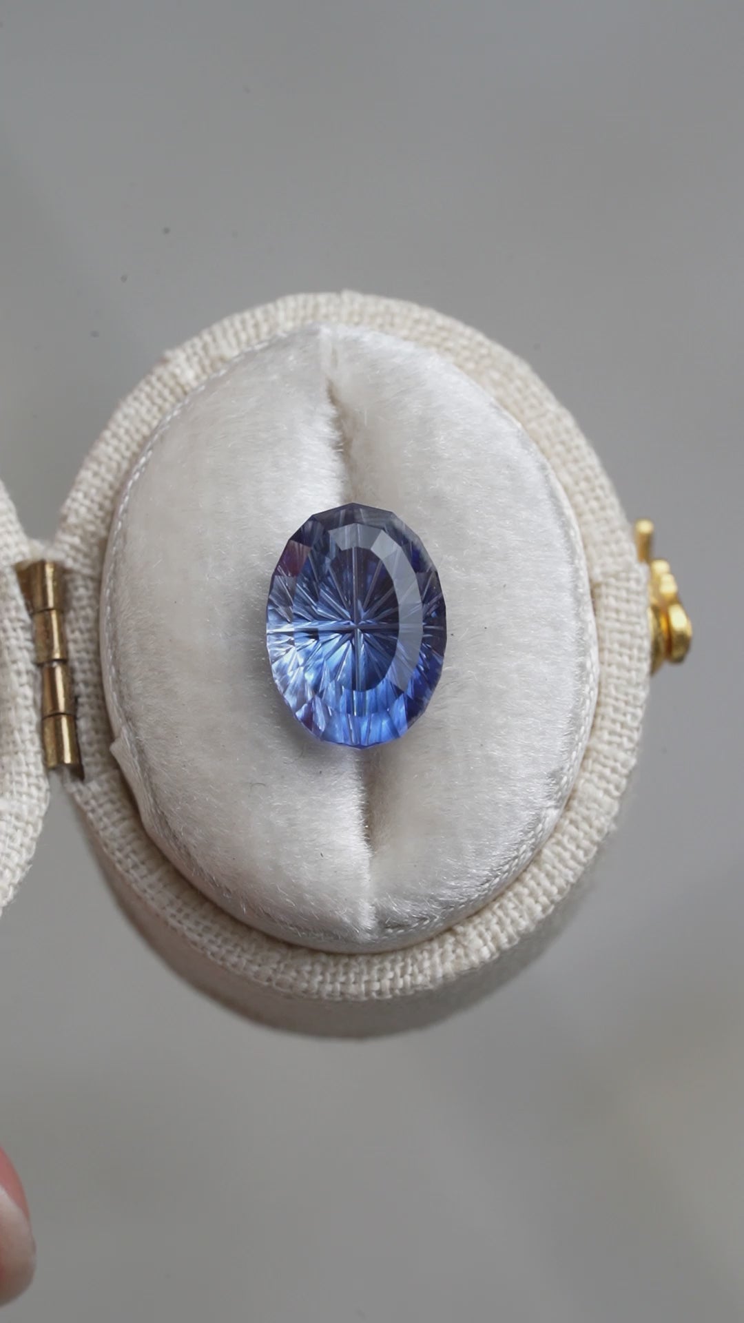 This blue lab sapphire is faceted in a fantasy cut oval design. It's really bright and has great light reflection and coloring!